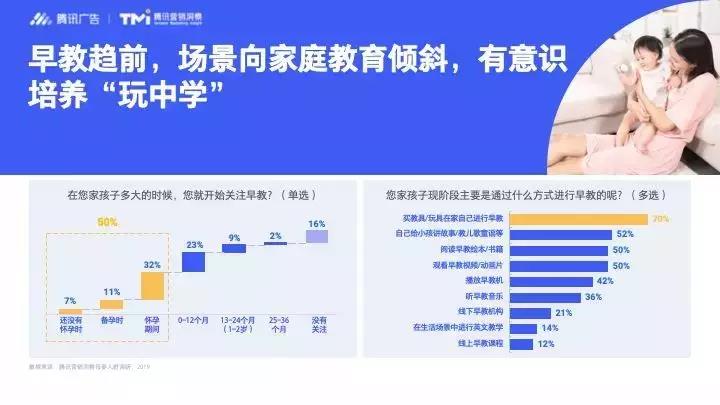 除了基本“保育”,“教育”也是母嬰人群關(guān)注的焦點。洞察顯示,50%的家長在孩子出生前就已經(jīng)在關(guān)注早教知識,不能讓孩子輸在起跑線上成為家長共同的焦慮。同時,在調(diào)查中70%的父母都選擇了在家進(jìn)行早教,早教場景明顯向家庭教育傾斜,父母們有意識培養(yǎng)孩子“玩中學(xué)”。