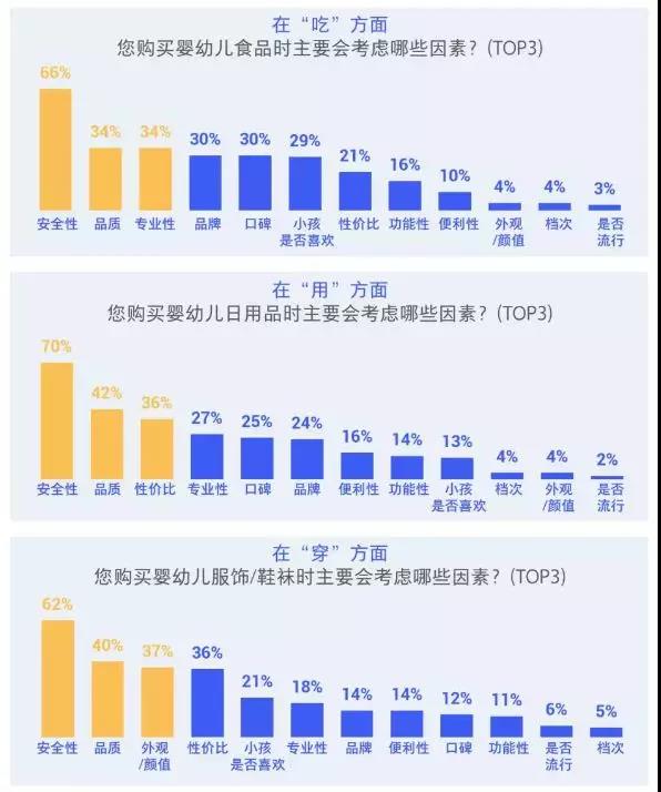 數(shù)據(jù)顯示,消費者在選購母嬰產(chǎn)品時的各類考慮因素中,安全性和品質(zhì)最受重視,占比分別超過60%,其中購買嬰幼兒食品注重安全性因素高達(dá)66%,是否流行因素最低僅有3%。